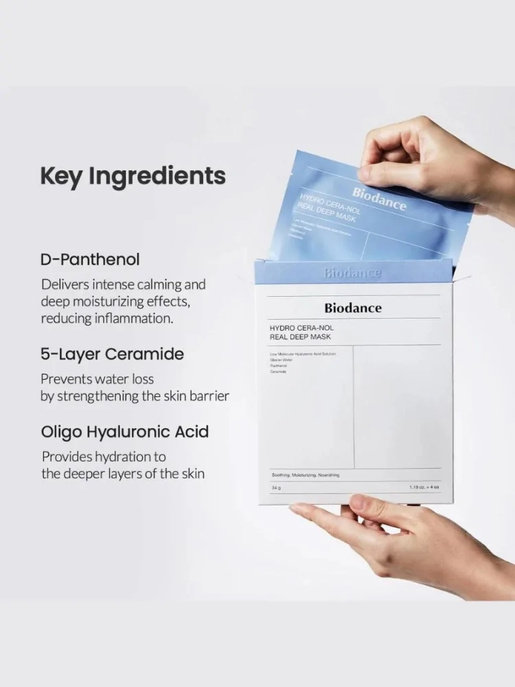 Η Hydro Cera-Nol Real Deep Mask περιέχει ισχυρά συστατικά που παρέχουν γρήγορη καταπραϋντική δράση χάρη στα μοναδικά συστατικά του BIODANCE (D-πανθενόλη, ολιγο-υαλουρονικό οξύ, κεραμίδια 5 στρώσεων).