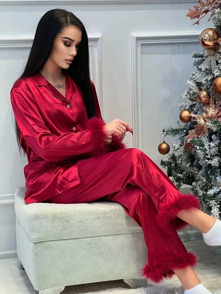 Σατεν πιτζάμες με φτερά στο τελείωμα στα μανίκια και στο παντελόνι