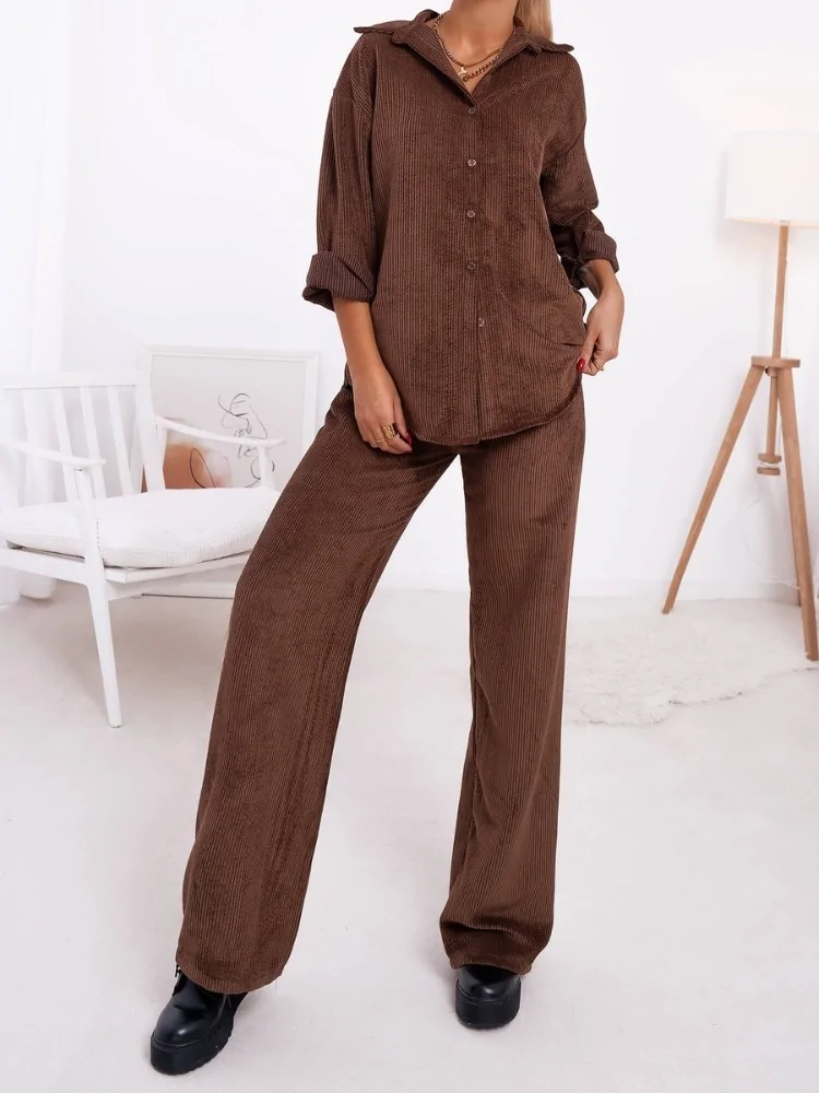 Ανακαλύψτε το κοτλέ σετ GATIEN, το outfit που συνδυάζει τη διαχρονική κομψότητα με την απόλυτη άνεση. Αποτελούμενο από παντελόνι και πουκάμισο σε κοτλέ ύφασμα, το σετ αυτό είναι η τέλεια επιλογή για chic καθημερινές εμφανίσεις και μοντέρνες, casual-chic στιγμές.