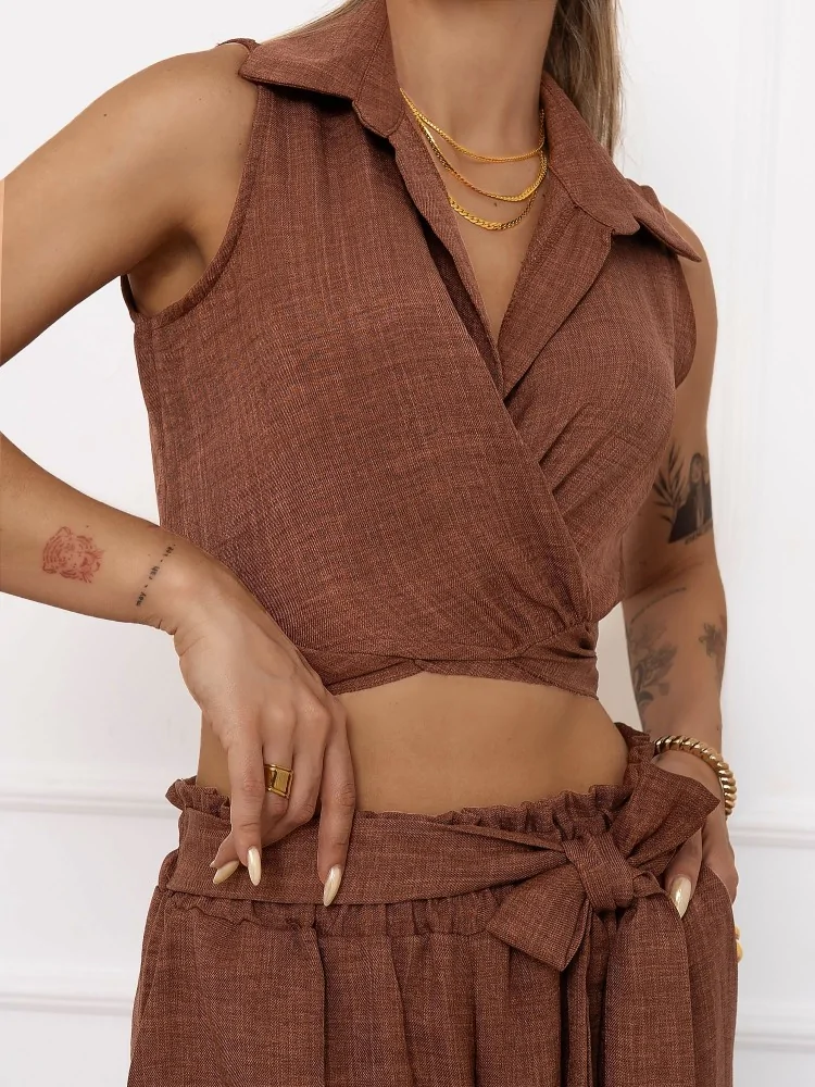 υφασμα λινου τυπου τοπ κρουαζέ αμάνικο με παντελόνα με λάστιχο