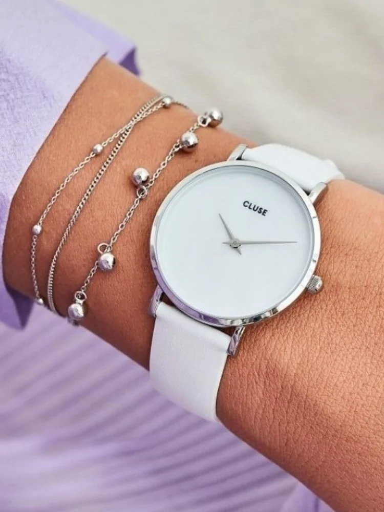 Ρολόι CLUSE με πλαίσιο από ασημί ανοξείδωτο ατσάλι διαμέτρου 33 χιλ. και καντράν από φίλντισι. Το ρολόι μπορεί εύκολα να συνδυαστεί και με άλλο δερμάτινο λουράκι ή μπρασελε (εύκολη αλλαγή). Αδιάβροχο στα 30 μ (τυχαία επαφή με νερό/πλύσιμο χεριών).